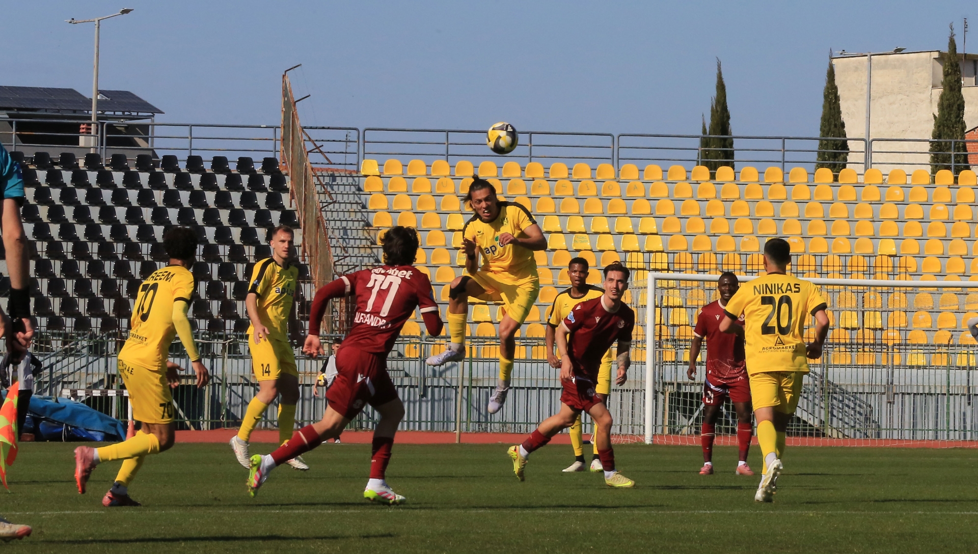 Ο Φρίμπονγκ έκανε το γύρισμα από τα δεξιά, με τον αμυντικό των Θεσσαλών, Γκόλια να κάνει μια προβολή στη μπάλα, δίνοντας της τροχιά προς τα δίχτυα αλλά ο Μπαλωμένος με μια εντυπωσιακή και δύσκολη απόκρουση έδιωξε τη μπάλα σε κόρνερ.