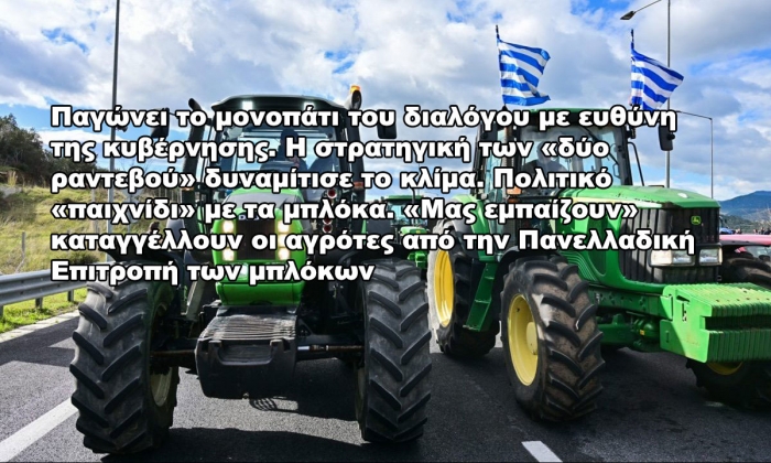 «Παγώνει» το μονοπάτι του διαλόγου με ευθύνη της κυβέρνησης. Η στρατηγική των «δύο ραντεβού» δυναμίτισε το κλίμα. Πολιτικό «παιχνίδι» με τα μπλόκα. «Μας εμπαίζουν» καταγγέλλουν οι αγρότες από την Πανελλαδική Επιτροπή των μπλόκων