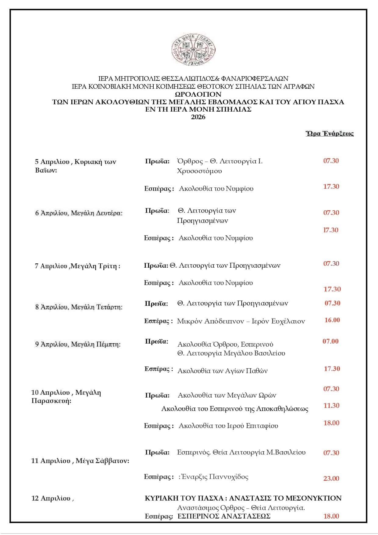 Την Κυριακή του Πάσχα 12 Απριλίου και ώρα 7:00΄μ.μ., θα τελέσει την ακολουθία του