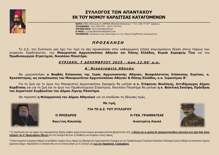 Επιμνημόσυνη δέηση την Κυριακή, 7 Δεκεμβρίου στο Α’ Νεκροταφείο Αθηνών για τον Μακαριστό Αρχιεπίσκοπο Σεραφείμ Τίκα και τον Πρωθυπουργό-Στρατηγό Νικόλαο Πλαστήρα