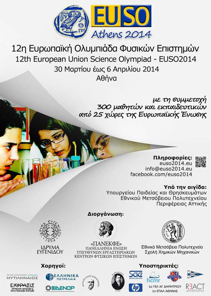 Στην Αθήνα την περίοδο 30 Μαρτίου έως 6 Απριλίου θα διεξαχθεί η 12η Ευρωπαϊκή Ολυμπιάδα Φυσικών Επιστημών - EUSO 2014. Τη διοργάνωση έχει αναλάβει η Πανελλήνια Ένωση Υπευθύνων Εργαστηριακών Κέντρων Φυσικών Επιστημών (ΠΑΝΕΚΦΕ), δηλαδή οι εκπαιδευτικοί των Εργαστηριακών Κέντρων Φυσικών Επιστημών που επιμορφώνουν τους καθηγητές Μέσης Εκπαίδευσης στην προσπάθεια τους για την ένταξη του πειράματος στη διδασκαλία των Φυσικών Επιστημών.