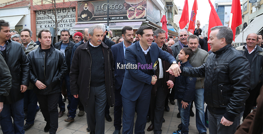 Θερμή υποδοχή επιφύλαξαν για τον Αλέξη Τσιπρα στην Καρδίτσα δεύτερο σταθμό της σημερινής περιοδείας του προέδρου του ΣΥΡΙΖΑ στην Θεσσαλια .