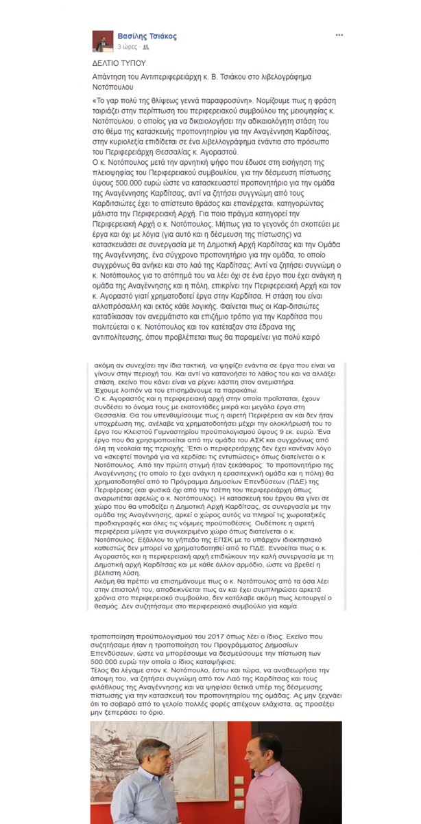 Απάντηση του Αντιπεριφερειάρχη κ. Β. Τσιάκου στο λιβελογράφημα Νοτόπουλου