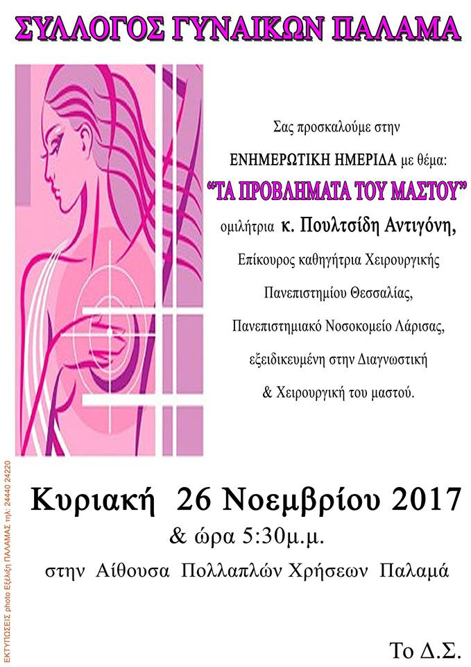 Ο Σύλλογος Γυναικών Παλαμά, σε συνδιοργάνωση με την Ένωση Πολιτιστικών Συλλόγων Ν. Καρδίτσας,  οργανώνει ενημερωτική ημερίδα με θέμα: «Τα προβλήματα του μαστού» την Κυριακή 26 Νοεμβρίου 2017 και ώρα 5.30μ.μ. στην Αίθουσα Πολλαπλών Χρήσεων Παλαμά.
