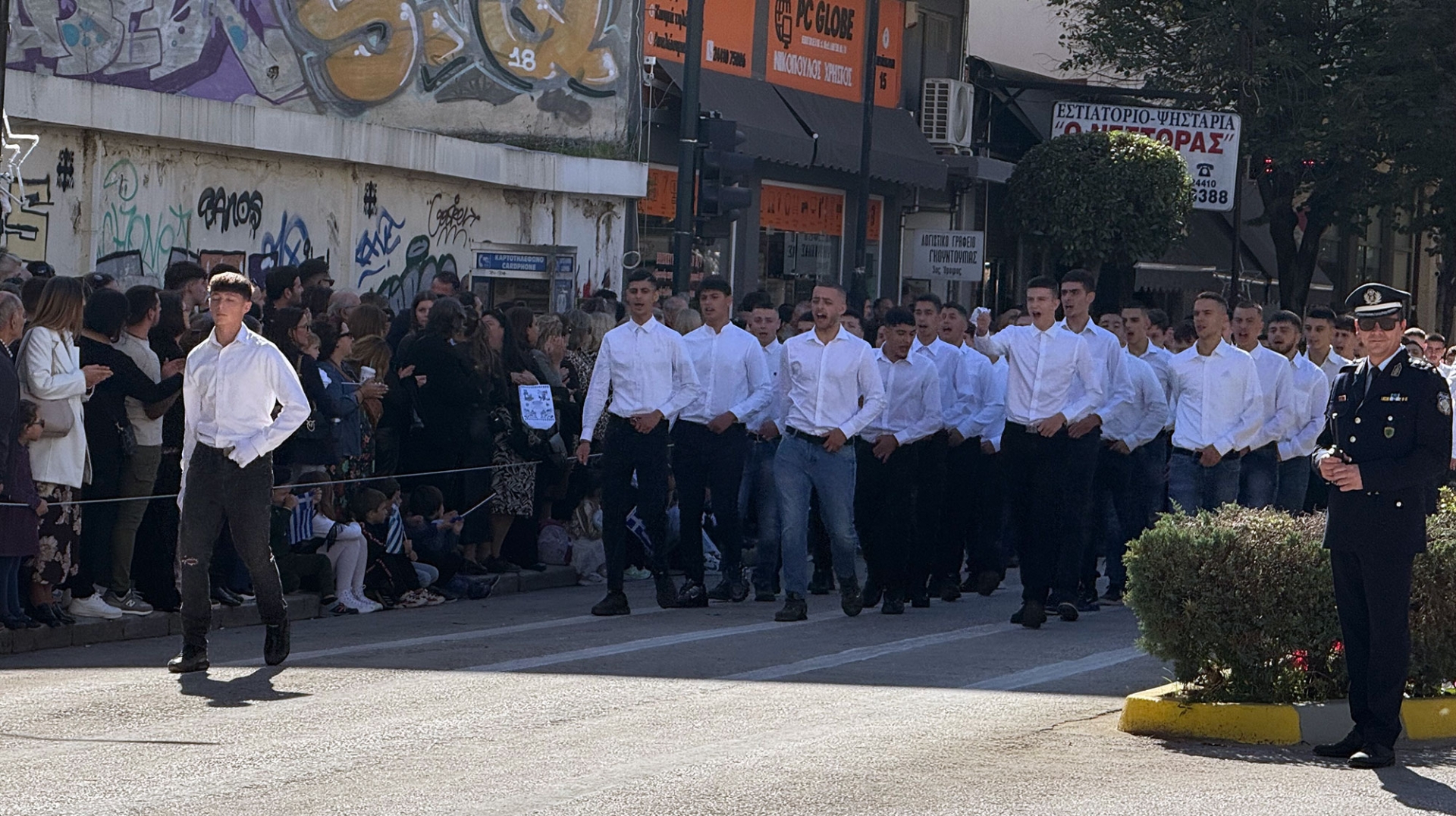 Στην κεντρική οδό της Καραϊσκάκη παρέλασαν τμήματα μαθητών από τα δημοτικά, γυμνάσια και λύκεια της πολης ,πολιτιστικών συλλόγων και την παρέλαση έκλεισαν τμήματα των σωμάτων ασφάλειας και πεζοπόρα τμηματα της στρατιωτικής φρουράς του Κέντρου Εκπαιδεύσεως Στρατονομίας