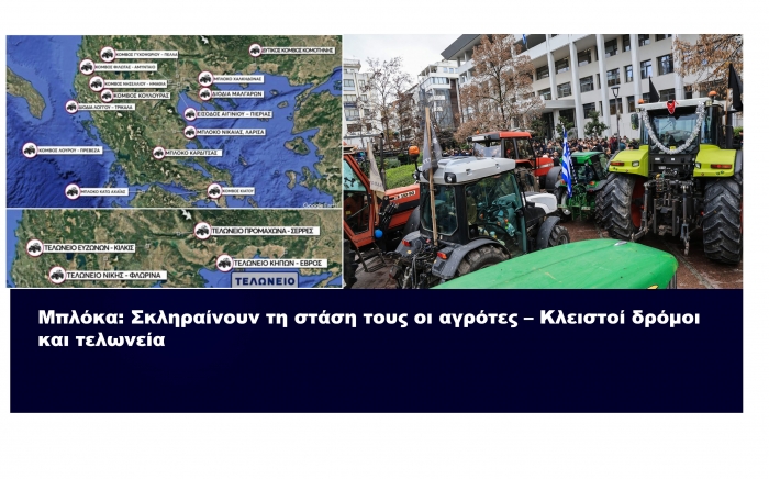 Στη Νίκαια, ένα από τα μεγαλύτερα μπλόκα της χώρας, ο αριθμός των τρακτέρ αυξάνεται καθημερινά. Κλειστή παραμένει η Εθνική Οδός Αθηνών-Θεσσαλονίκης ενώ στα Μάλγαρα, κλειστή παραμένει η Εθνική Οδός στο ρεύμα προς Αθήνα. Κλειστή είναι και η Εγνατία, στο ρεύμα κυκλοφορίας προς Βέροια στον κόμβο της  Αλεξάνδρειας.