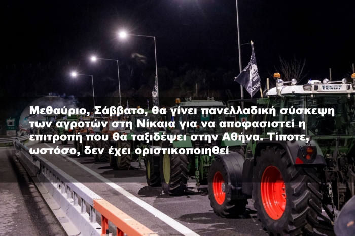 Οι αγρότες βρίσκονται σε διαβουλεύσεις μεταξύ τους για τη συνέχιση των κινητοποιήσεών τους, ενώ το Σάββατο αναμένεται η πανελλαδική σύσκεψη, όπου θα συζητηθεί το μέλλον των δράσεων και θα οριστεί επιτροπή για τη συνάντηση της ερχόμενης Τρίτης με τον πρωθυπουργό.