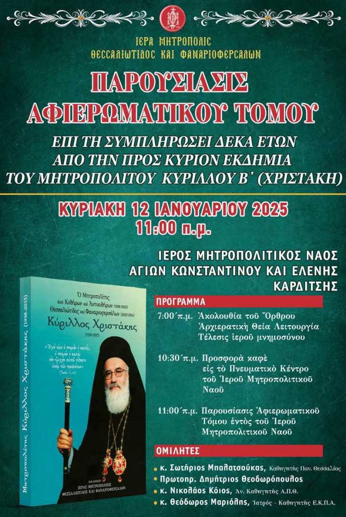 Ἡ Ἱερὰ Μητρόπολις Θεσσαλιώτιδος καὶ Φαναριοφερσάλων γνωστοποιεῖ, ὅτι τὴν 10ην Ἰανουαρίου 2025 συμπληροῦνται δέκα (10) ἔτη ἀπὸ τὴν εἰς Κύριον ἐκδημίαν τοῦ μακαριστοῦ Μητροπολίτου της, Θεσσαλιώτιδος καὶ Φαναριοφερσάλων κυροῦ Κυρίλλου τοῦ Β’ (Χριστάκη).