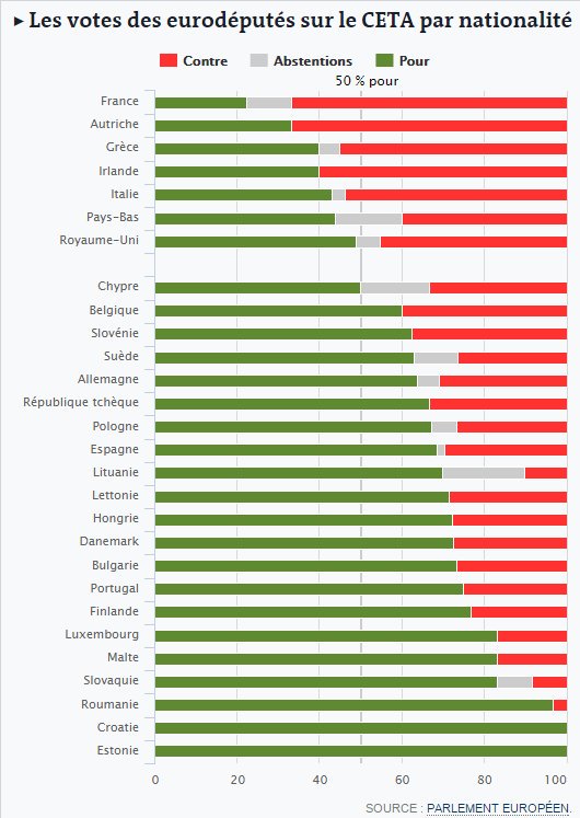 Όπως ήταν αναμενόμενο η εμπορική ληστρική συμφωνία μεταξύ Καναδά και Ε.Ε. ψηφίστηκε στο Ευρωκοινοβούλιο την Τετάρτη 15 Φεβρουαρίου 2017. Ψήφισαν 695 Ευρωβουλευτές: ΥΠΕΡ 408 - ΚΑΤΑ 254 - ΑΠΟΧΕΣ 33.